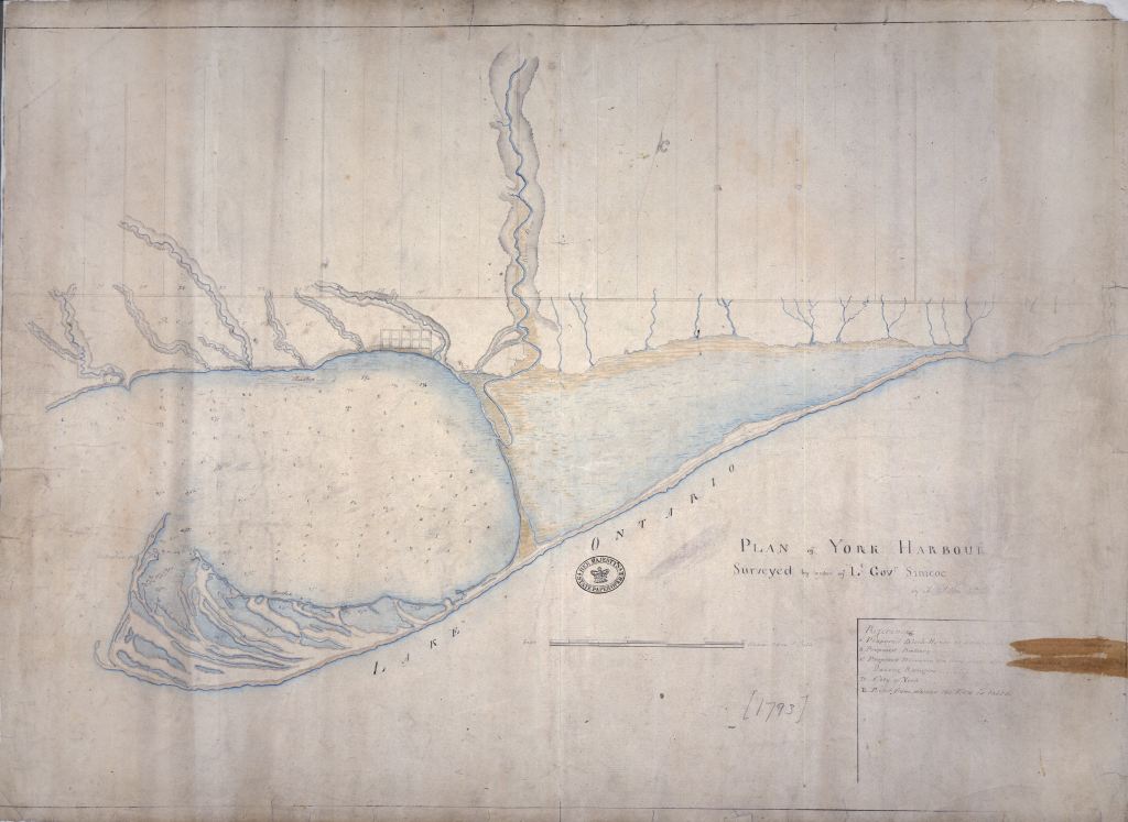 1793 Simcoes arrived at Toronto and renamed it York. 1793 A. Aitken’s Plan of York Harbour. Shows “The Bend” and sandbar at the east end of the harbour separating Toronto Bay from Ashbridges Bay. Don had two mouths.