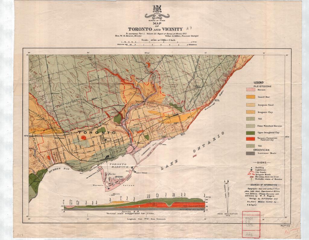 Most of this area consists of modern fill that was dredged, dumped and engineered in the early 20th century. Some parts of the port lands were completed as late as the 1960s.