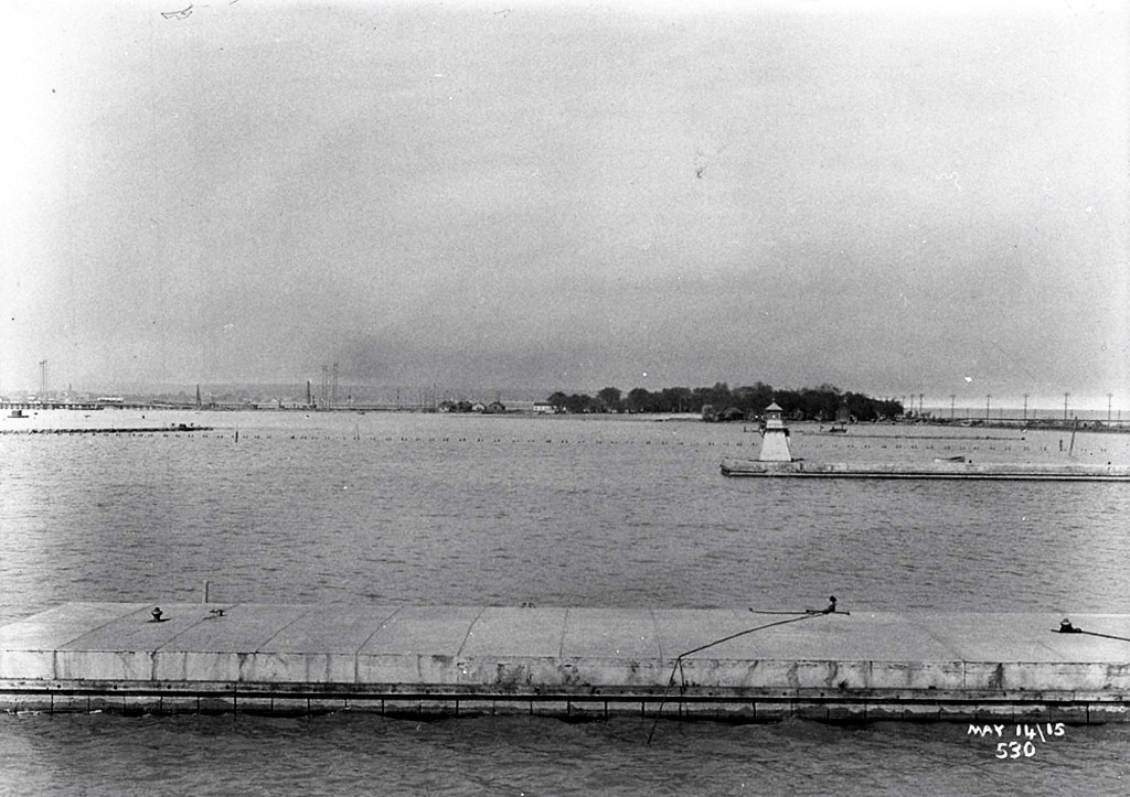 1893 Coatsworth’s Cut made the separation of Woodbine Beach and Fisherman’s Island. permanent. Both were cottage communities in the summer. New Windmill Line. Expansion to allow deep water piers without need for further dredging. New lake boats had drafts greater than 10 feet. City built a new shore wall of rock-filled timber cribs on the New Windmill Line and filled with municipal garbage. Work completed by, 1899. Keating Channel dredged by City Engineer Dept.