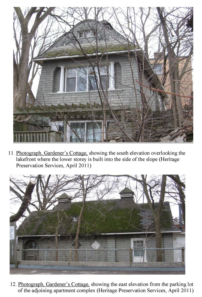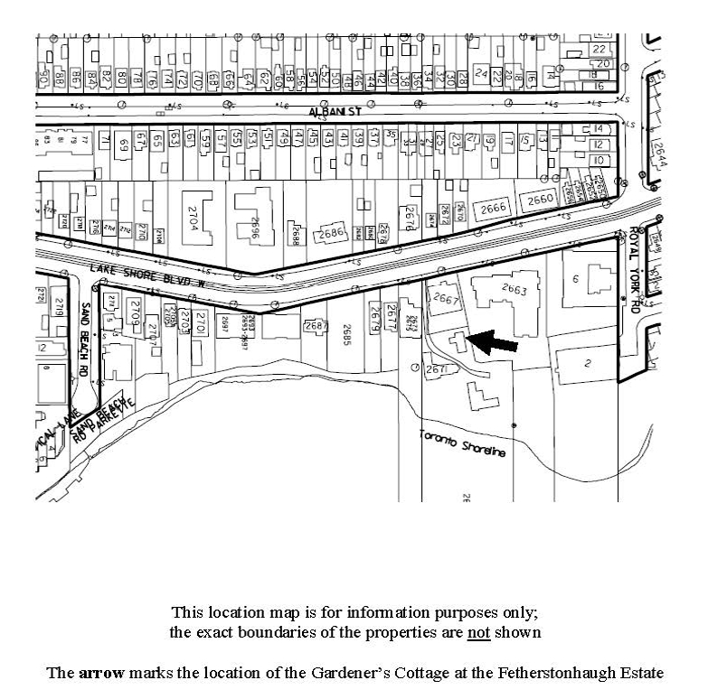 The Gardener’s Cottage, which was built behind (southwest of) the main residence, faces west toward a driveway that leads from Lake Shore Boulevard West (where it is entered west of the Eldorado Apartments) and down a slope toward Lake Ontario. The cottage sits on the top of this ridge, where it overlooks the Boathouse that is placed near the shore of Lake Ontario below. With the alterations to the Boathouse, the land adjoining it to the south and west was infilled so that the structure is removed from the water. The properties containing the Gardener’s Cottage and Boathouse retain some of the landscaping associated with the Fetherstonhaugh Estate, including stone steps, break walls and a well, along with frontage on the waterfront (Images 15 and 16). from Intention to Designate under Part IV, Section 29 of the Ontario Heritage Act – 2669-2673 Lake Shore Boulevard West, City of Toronto, April 20, 2011 available on line at chrome-extension://efaidnbmnnnibpcajpcglclefindmkaj/https://www.toronto.ca/legdocs/mmis/2011/pb/bgrd/backgroundfile-37649.pdf