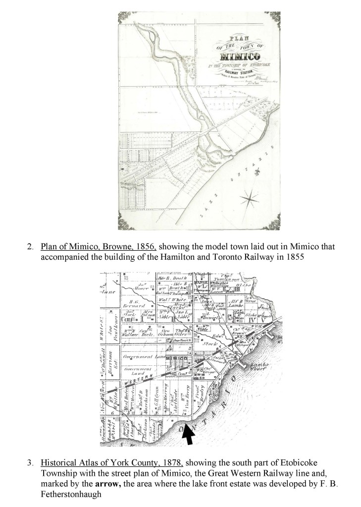 The properties at 2669-2673 Lake Shore Boulevard West are located in the community of Mimico.2 Originating as part of the Township of Etobicoke, the lands along the north shore of Lake Ontario, west of Mimico Creek, were subdivided in the mid 19th century as a model town for workers building the Hamilton and Toronto Railway (a branch of the Great Western Railway, Image 3). The 1856 plan for Mimico is illustrated in Image 2.