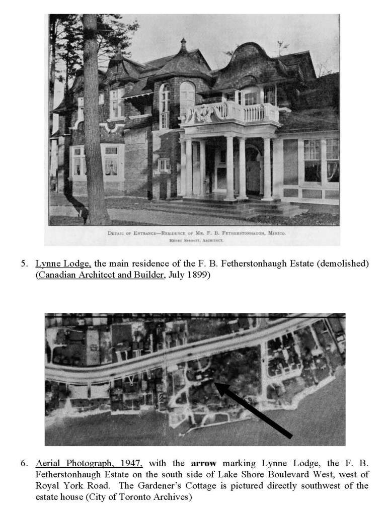 The remnants of the Fetherstonhaugh Estate at 2669-2673 Lake Shore Boulevard West are found on the south side of the street, west of Royal York Road. However, the buildings are not visible from Lake Shore Boulevard West where they are concealed by the apartment complexes and house form buildings dating to the post-World War II era.