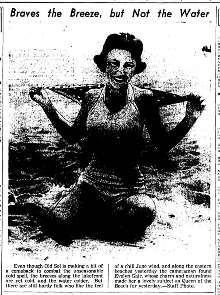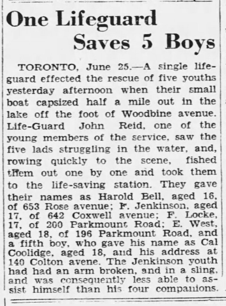 View off life-saving station tower looking north showing Dredge No. 3, Ward’s Island Toronto, Ont., June 15, 1915 View off life-saving station tower looking north showing Dredge No. 3, Ward’s Island Toronto, Ont., June 15, 1915 Kew Beach from the water, June 15, 1918Canoes for sale, Lakefront, Toronto Star, June 15, 1923Sunnyside Pavilion to open, Globe, June 15, 1923Casino, Toronto Island, Toronto Star, June 15, 1923Lifeguard John Reid saves 5 boys Woodbine Beach, Windsor Star, June 15, 1929Evelyn Gair, Eastern Beaches, Globe and Mail, June 15, 1939Women at Sunnyside, Toronto Star, June 15, 1963Ferry Docks, Centre Island, Toronto, Ont. June 15, 1954Beaches new pool, Toronto Star, June 15, 1963Garbage collectors in the Beaches area pick up bundles of newspapers for recycling, June 15, 1972, by Graham Bezant