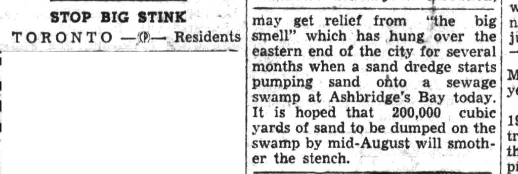 Leslieville Rowing Club, Globe, June 17, 1880June 17, 1880 ticket excursion, The Sons of Scotland was a fraternal society and Camp No. 3 was located at 300 King E, courtesy of Hugh HartClark Bros., Jasmine & John Hanlan, 17 June 1920Hanlan’s Point ad Toronto Star, June 17, 1922Scarborough Bluffs, Globe, June 17, 1922Sunnyside, four girls & man on board walk. – June 17, 1923Humber River, boys under falls. – June 17, 1923Sunnyside anglers, Globe, June 17, 1927Island Week TTC ad, Toronto Star, June 17, 1932East End beaches polluted by sewage plant, Globe, June 17, 1938Stinking Ashbridges Bay, Sault Daily Star, June 17, 1952Lee Hardwick and Bob Cavanaugh, Eastern Beaches, Globe & Mail, June 17, 1955